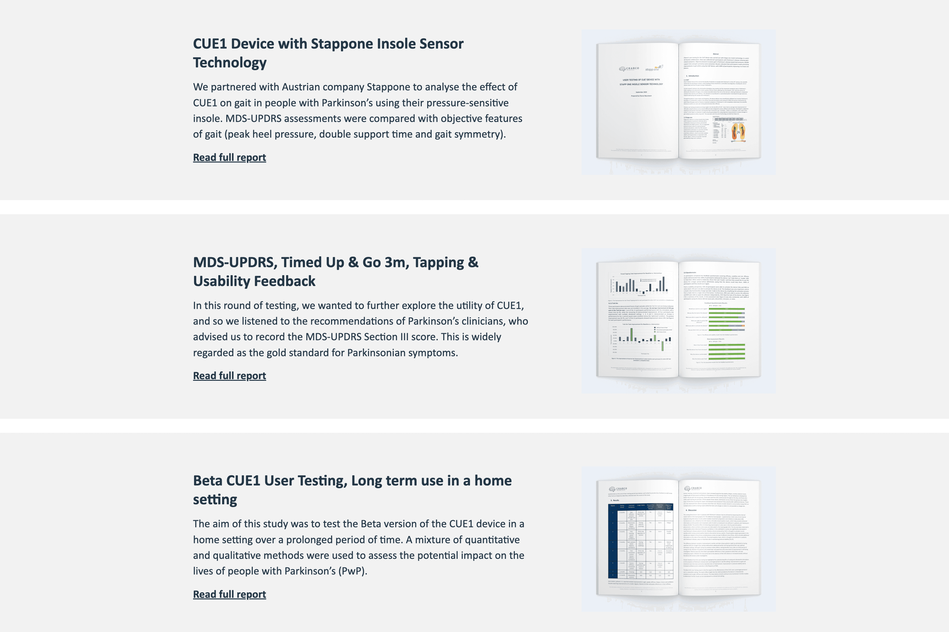 Charco-Stappone User Testing: In this early UK-Austria collaboration, we combined CUE1 with insole sensor technology to objectively measure gait improvements in 5 Parkinson’s patients. The study provided foundational data on peak heel pressure, double support time, and gait symmetry, confirming early efficacy and informing future trial designs.
