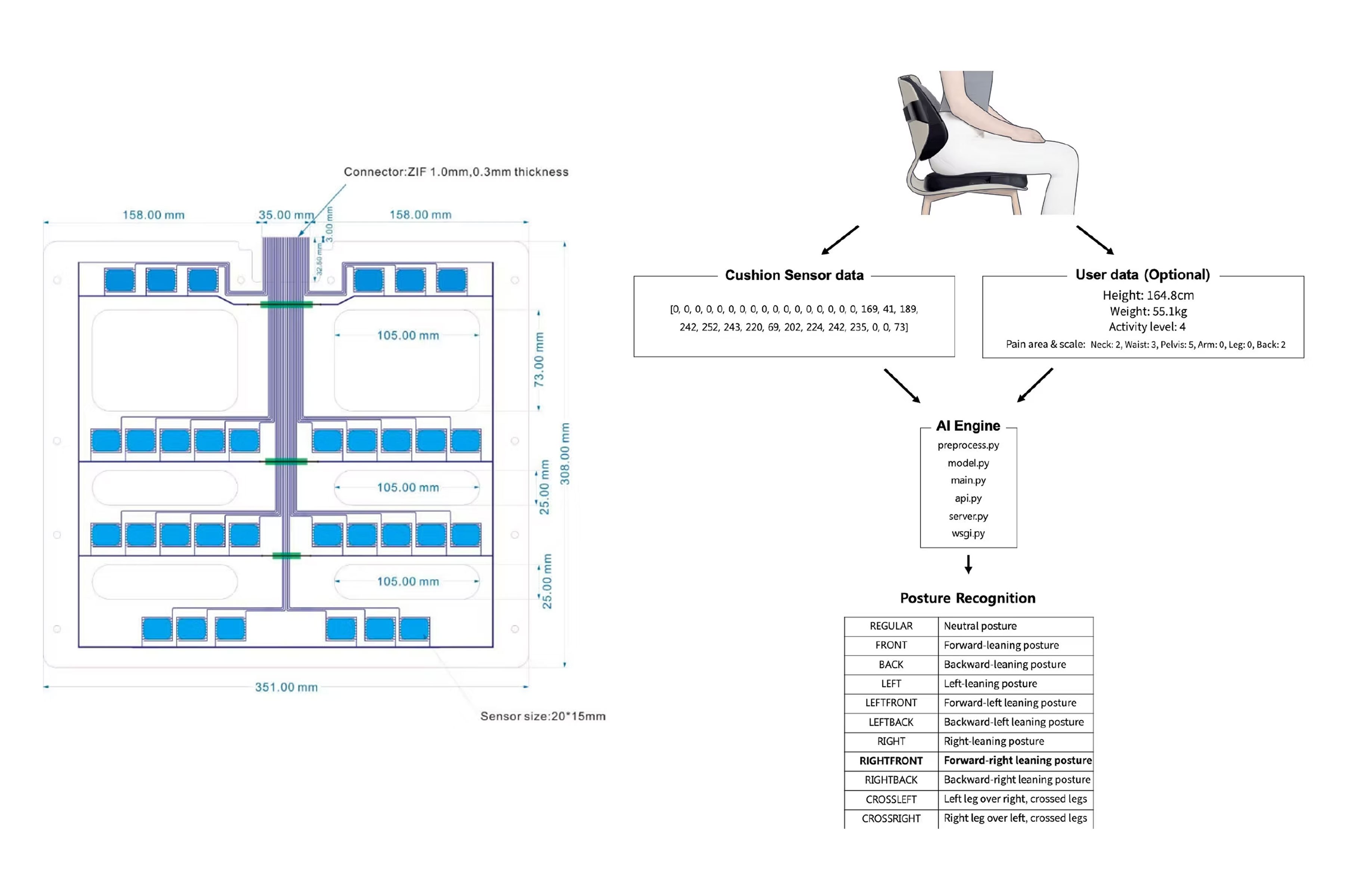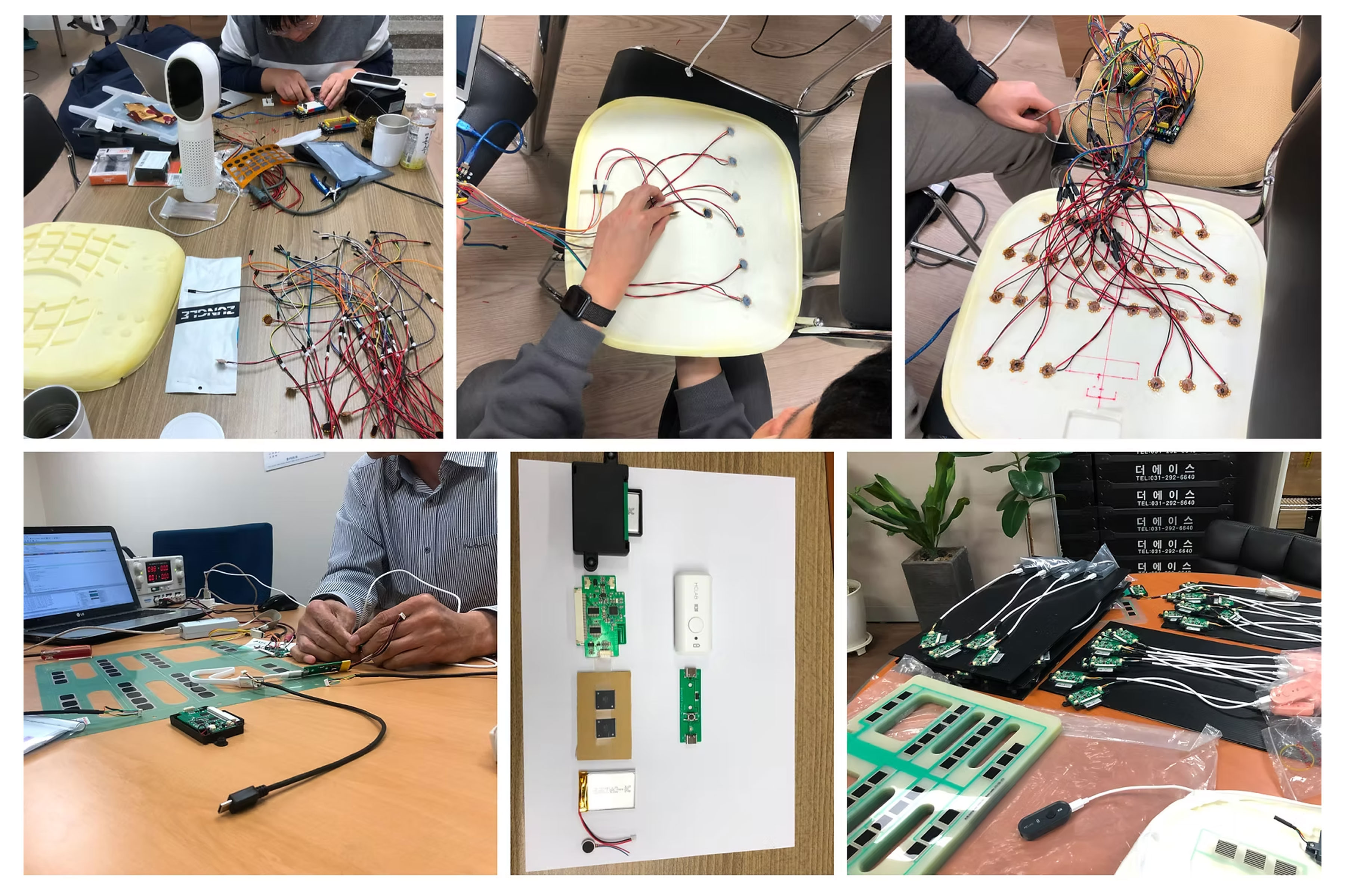 The next step was to bring intelligence into the cushion. To capture posture in real time, we embedded 32 Force-Sensitive Resistor (FSR) sensors, capable of detecting 11 distinct sitting postures — from leaning and crossing legs to forward or diagonal tilts. Early prototypes were built with Arduino boards, but as we prepared for mass production, we partnered with hardware specialists to design custom circuit boards tailored to our cushion’s structure. The final PCB system integrated a Bluetooth module and MCU chip for stable, low-latency data transmission, seamlessly connecting posture data to the mobile app.